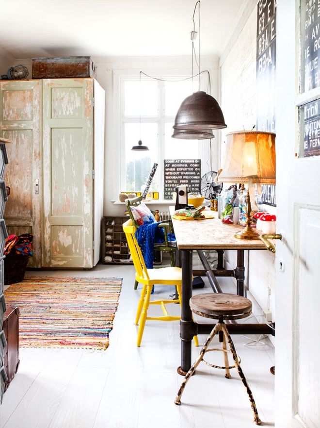 This is the very cool studio of the Swedish founders and owners of web shop In My House. Oh to work in a space described by Swedish interior magazine Hus o Hem as 'romantic-industrial', and surrounded by industrial lamps, vintage bus blinds, and brightly coloured furniture and rugs. Check out their shop for similar finds too!